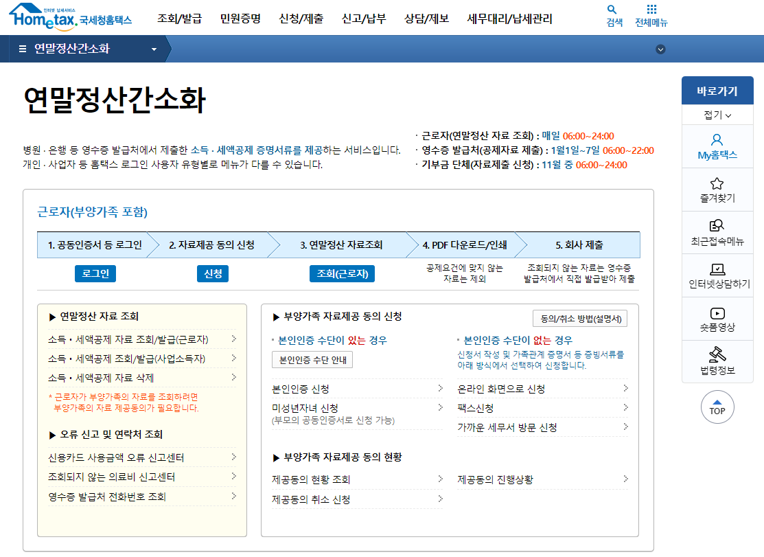 홈택스 홈페이지에 접속하여 '연말정산 간소화(공제자료 조회/발급)' 을 클릭합니다.