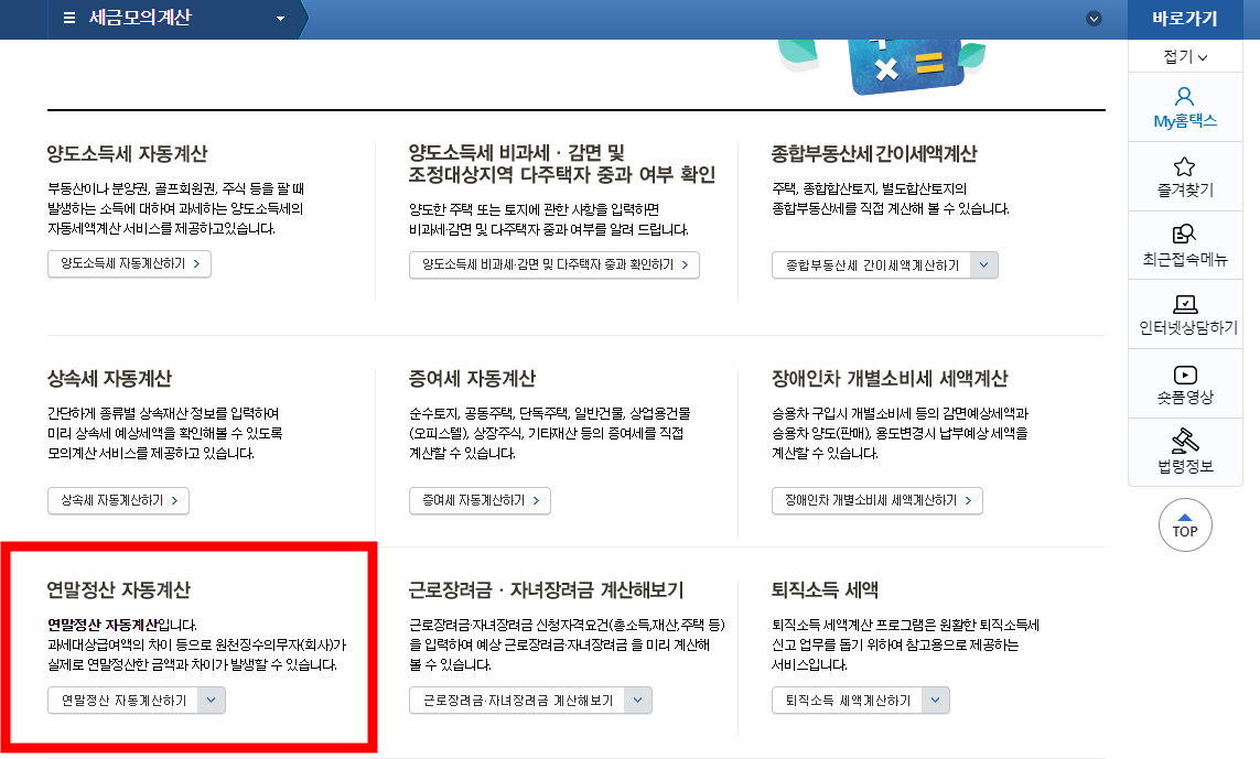 '홈 - 세금 모의계산 - 연말정산 자동계산' 에 들어가 원하는 연도의 자동계산을 선택 후 총급여 및 소득세(기납부세액), 고용보험료 등을 입력하시면 연말정산 환급금액을 확인할 수 있습니다.