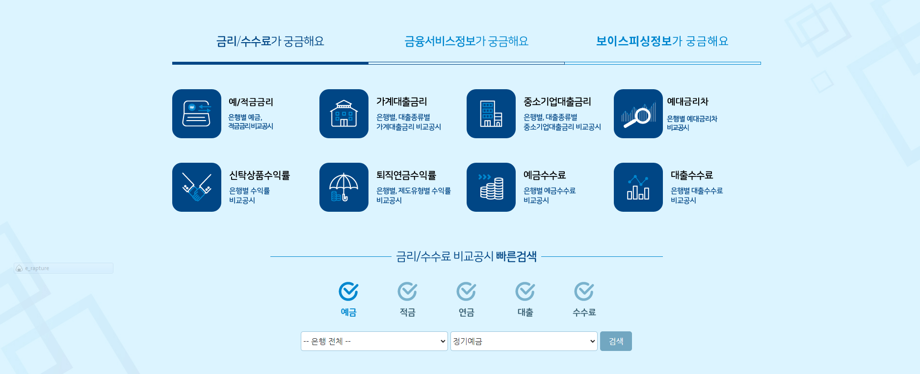 해당 사이트에 접속하여 소비자포털 - 금리/수수료가 궁금해요 메뉴에 들어가면 예/적금 금리를 확인할 수 있습니다.